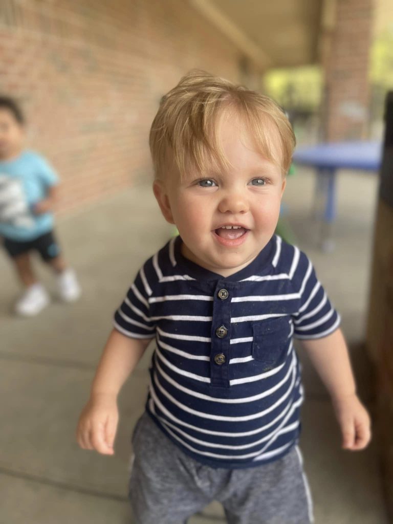 Welcome to the infant room! The age range in our room is typically 6 weeks- 12 months and mobile. Our room is the first step in your child’s early development. Our soft, calm, welcoming environment and staff provide the safety and security for positive development. We are different from most infant rooms. We have smaller teacher to child ratios, individualized lesson plans, gym time, and our own playground! Introducing prayer to all of our students, even our youngest, is important to us. We pray before meals together. Together, we work with parents to help their infant meet the milestones that build a foundation for cognitive, physical, social, emotional, and spiritual development.